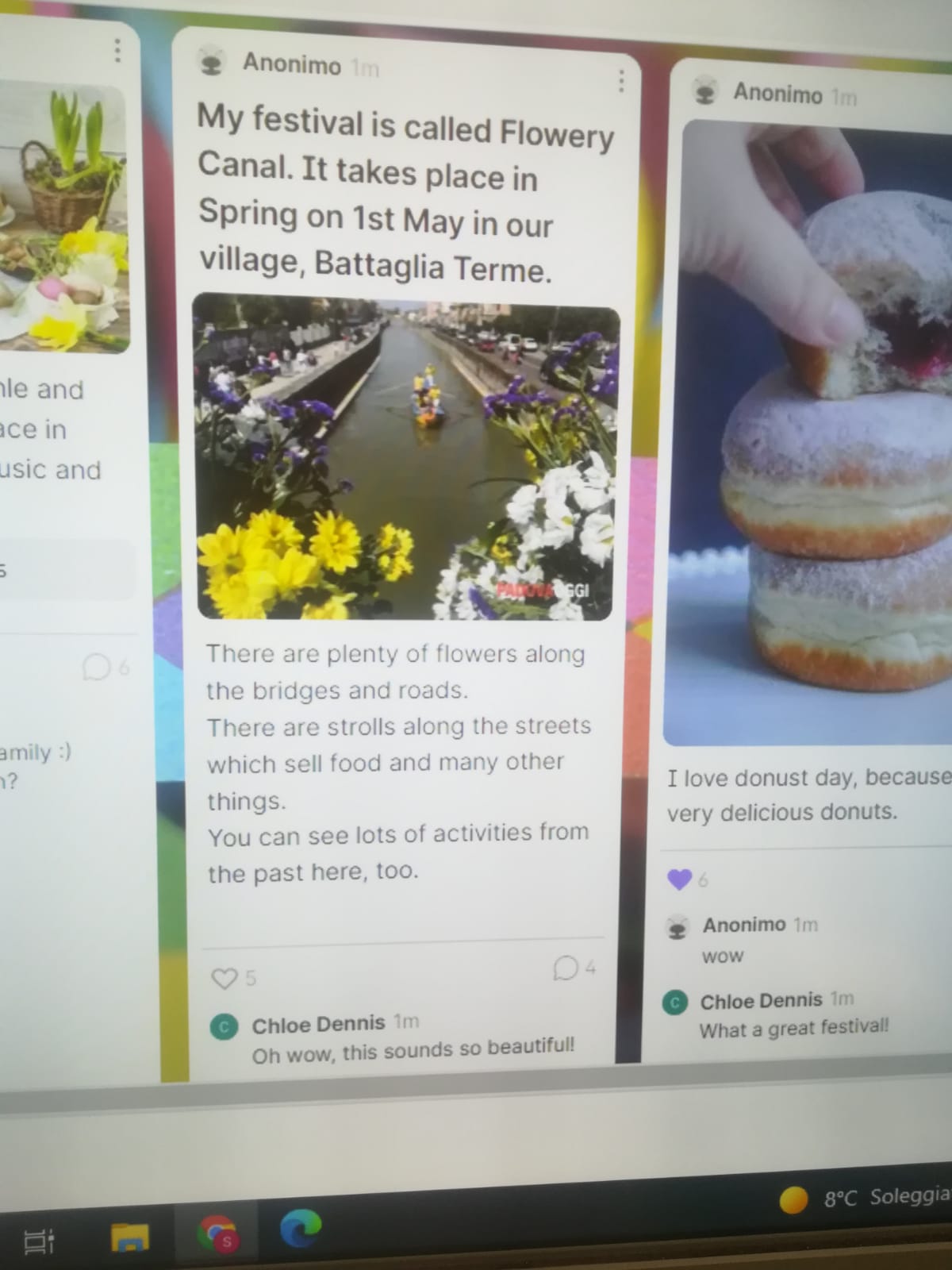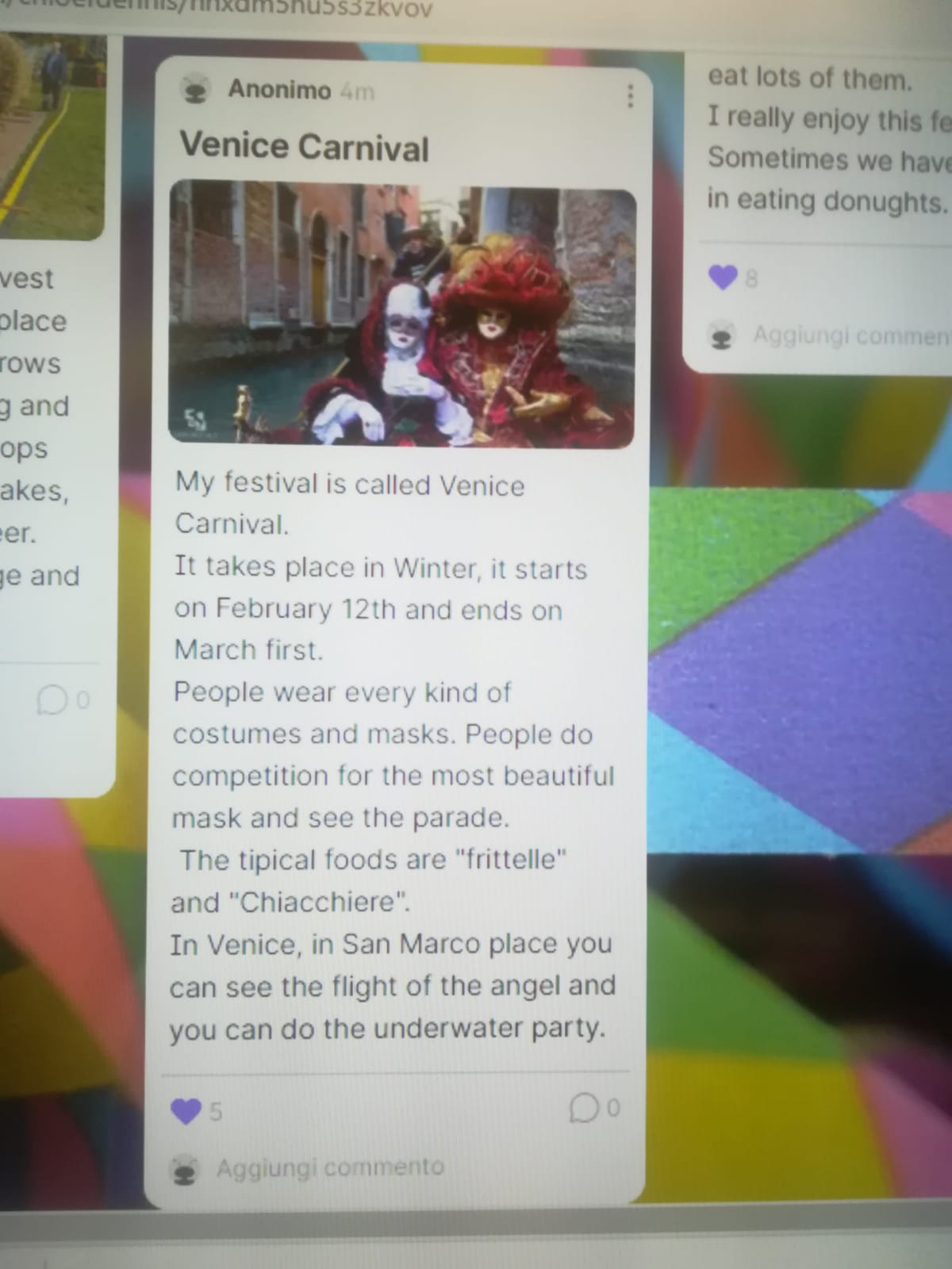 I nostri alunni delle classi seconde sono stati coinvolti nella descrizione di una festivitā tipica del loro paese in una bacheca virtuale condivisa da altri coetanei stranieri. Hanno parlato della festa che si svolge ogni anno il 1° maggio a Battaglia Terme, "Canale Fiorito" e del Carnevale di Venezia. E' stata un'esperienza davvero coinvolgente e motivante per tutti, insegnanti compresi.