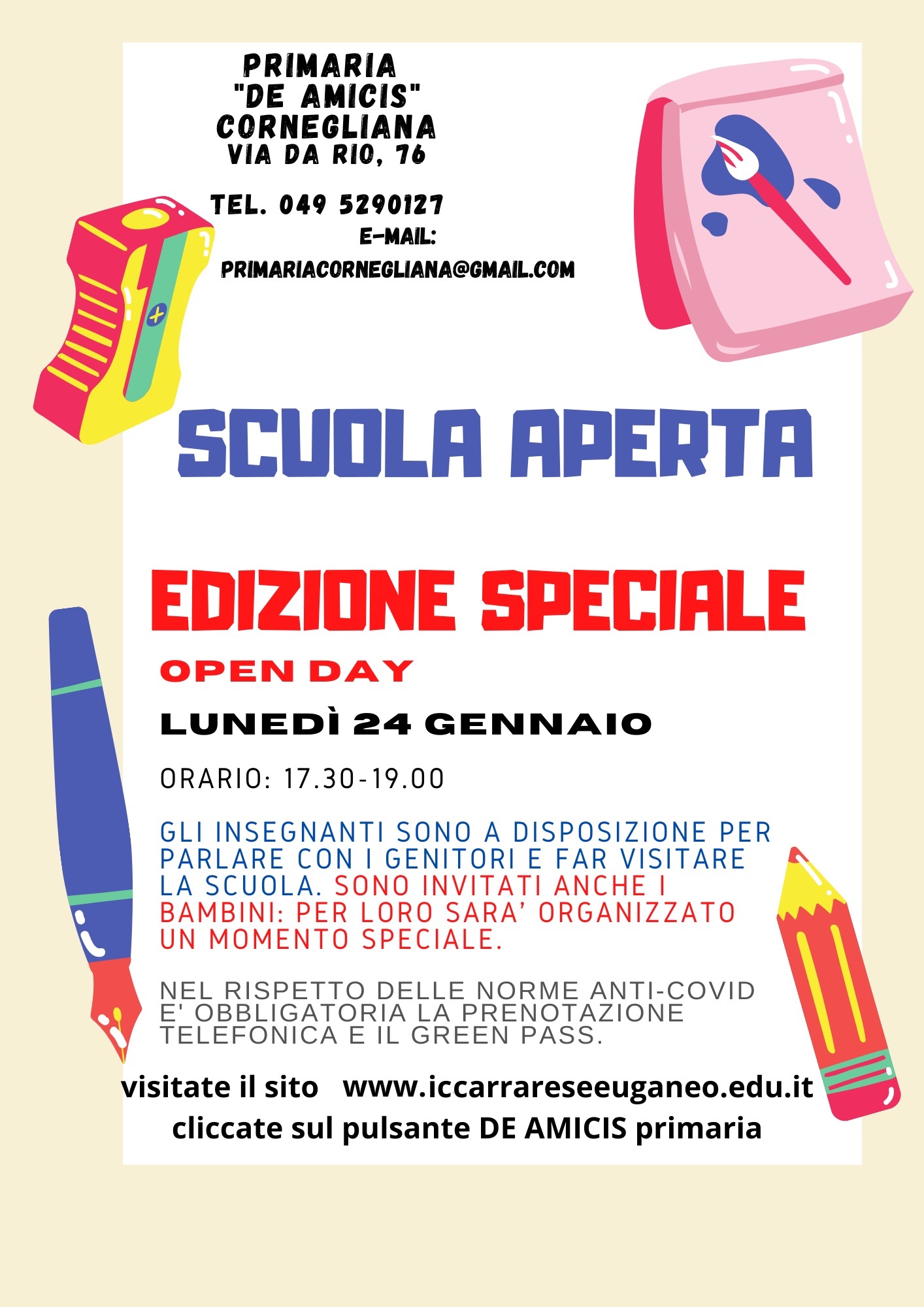 Eccezionalmente la scuola “E. De Amicis” di Cornegliana apre le porte ai genitori e ai bambini che hanno la curiosità di conoscere un ambiente d’apprendimento altamente inclusivo ed aperto al futuro.Le insegnanti vi accompagneranno alla scoperta della molteplicità di spazi e proposte didattiche.Vi a...