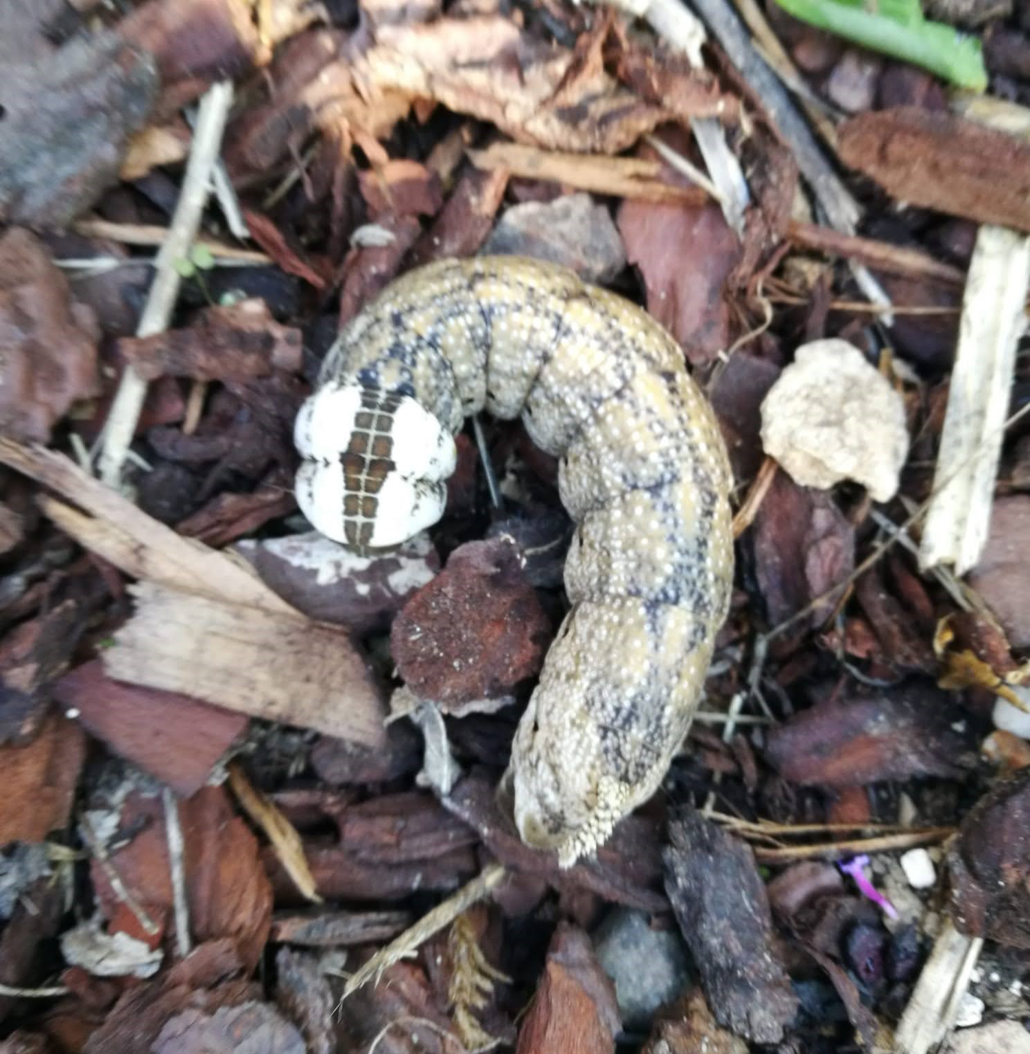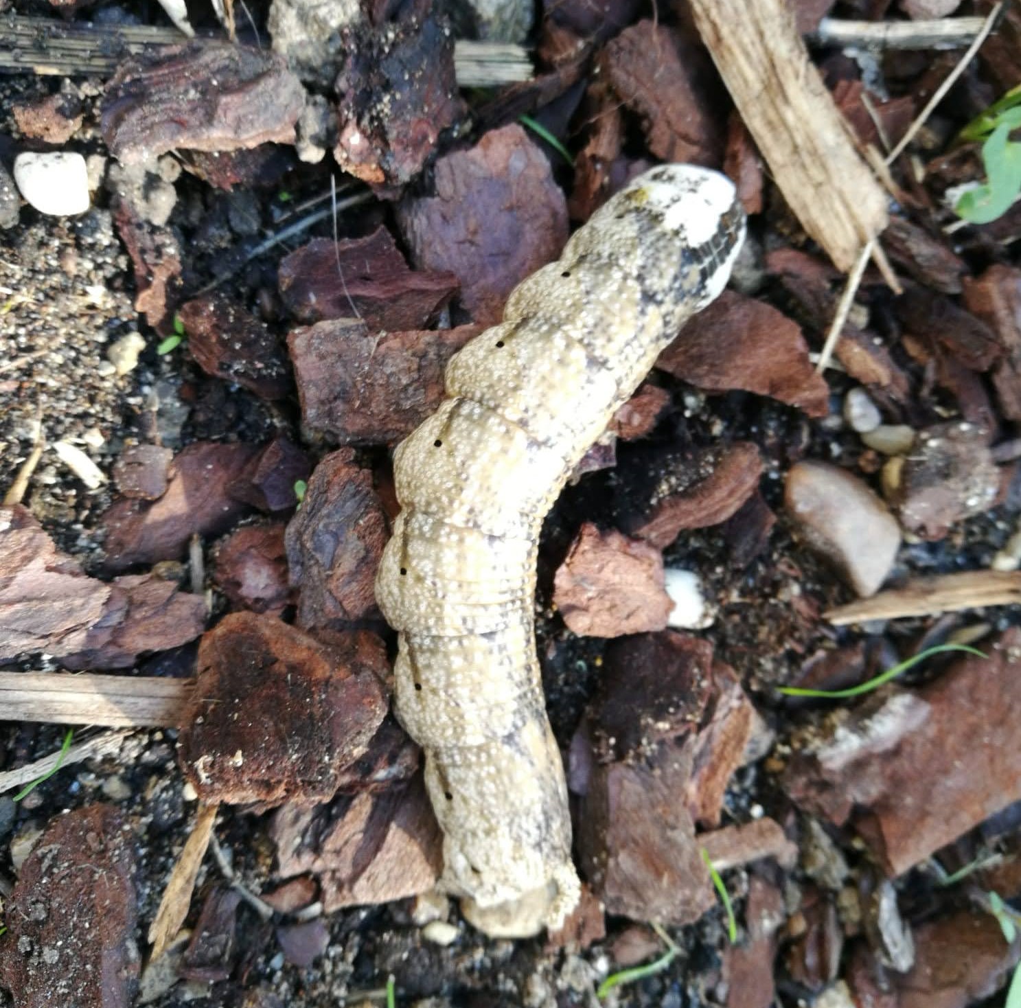 Sembra un bruco, ma è grosso come il dito di un adulto, è lungo 8-9 cm, ha una specie di maschera sulla testa e un cornino in coda. Si muove come un bruco.