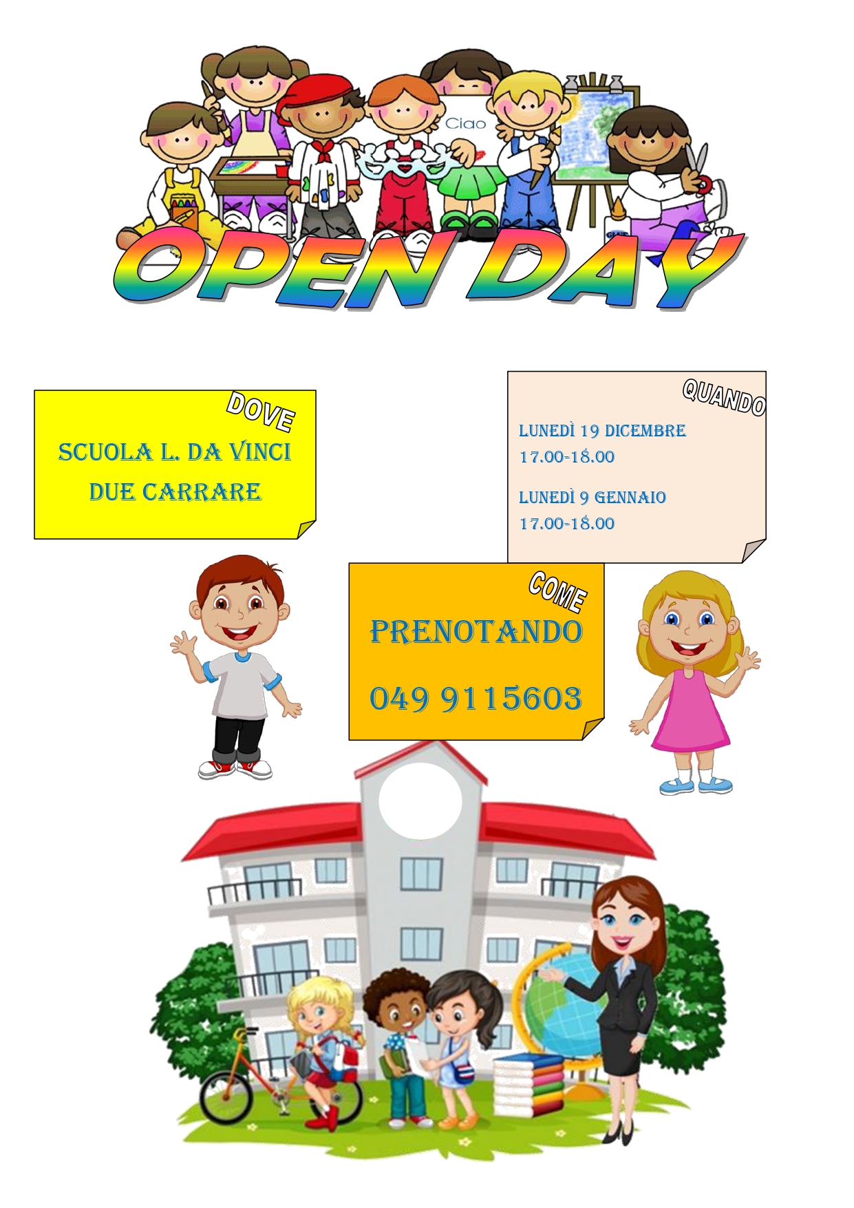 Vi aspettiamo Lunedì 9 Gennaio per la seconda giornata di Scuola Aperta. Mentre i vostri bambini saranno impegnati in un'attività laboratoriale potrete vedere da vicino i nostri ambienti educativi e insieme alle insegnanti conoscere l'offerta formativa della Scuola Primaria Da Vinci. Pren...
